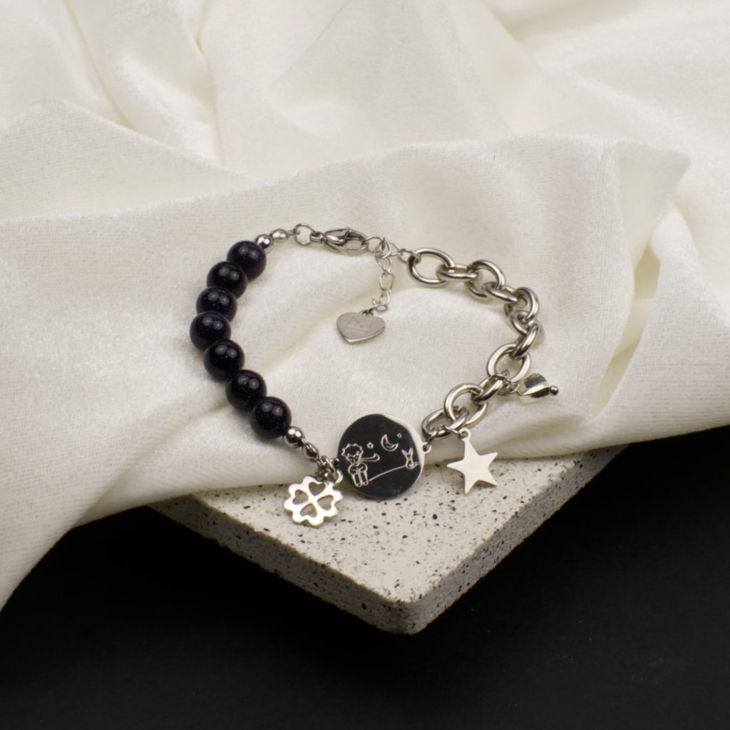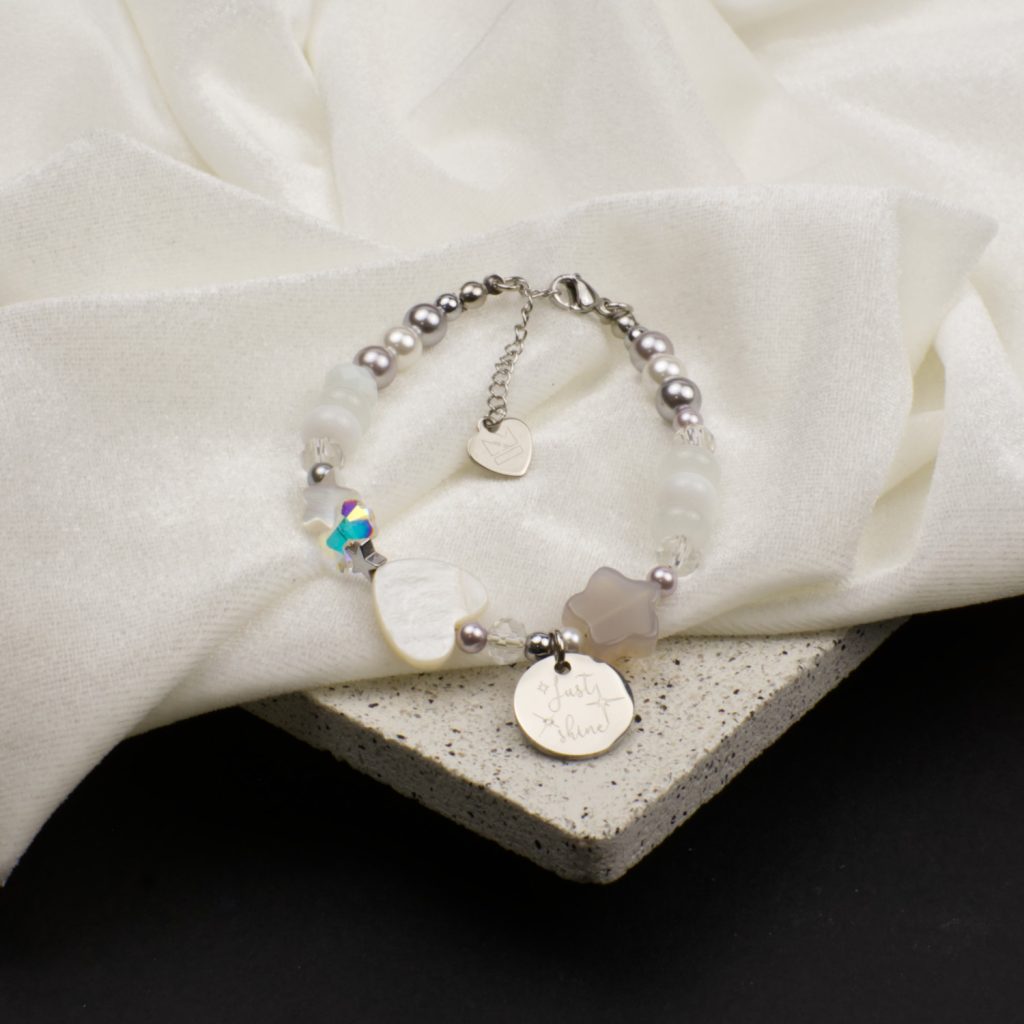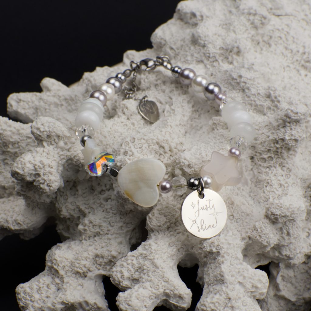 - Material: mother-of-pearl, hematite, stainless steel